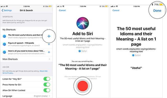 Si desea crear enlaces para estas acciones, pulse el botón Botón «+» a la siguiente sugerencia. A continuación, tienes que grabar tu frase personalizada. Para ello, pulse el botón botón de grabación y decir la frase. Tienes que grabarlo de nuevo. Cuando haya terminado, pulse Hecho en la esquina superior derecha para confirmar.