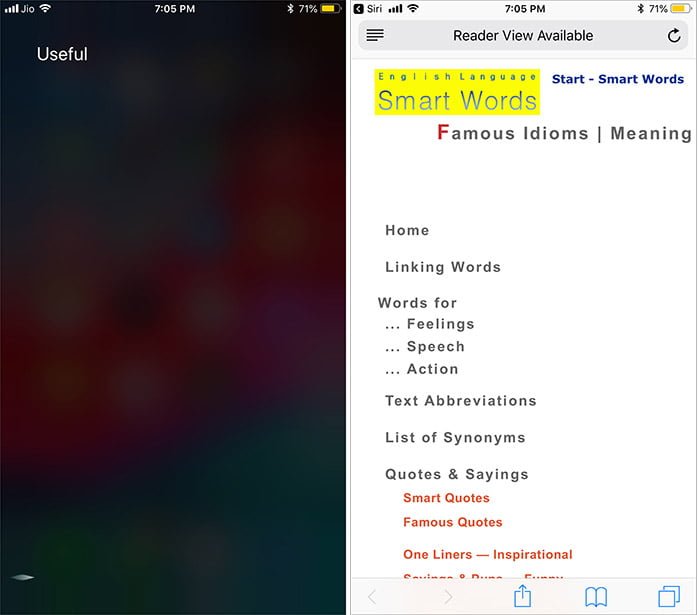 Como se muestra en la captura de pantalla anterior, he creado un acceso directo llamado «Útil» para conocer los 50 refranes más útiles y su significado. Cuando llamo a Siri y digo » Útil » me lleva directamente a ese sitio.