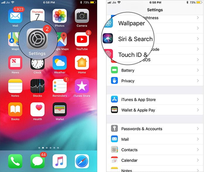 Paso 1. Abrir el Aplicación de configuración en su dispositivo iOS → pulse Siri y la búsqueda .