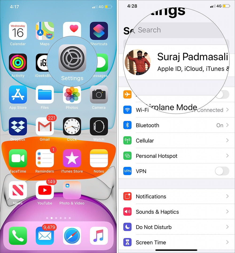 Paso 1. Inicie el aplicación Ajustes y pulse sobre su nombre desde arriba.