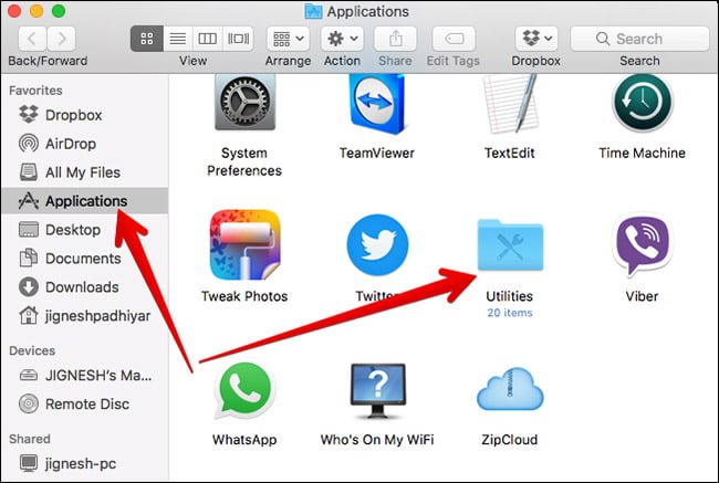 Paso 2. A continuación, haga clic en Aplicaciones en la barra lateral. A continuación, debe hacer doble clic o pulsar mientras se mantiene pulsado la tecla Ctrl en el Carpeta de utilidades .