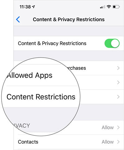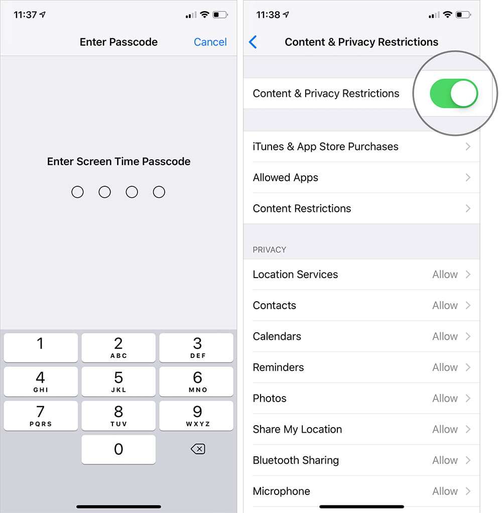 Paso 2. A continuación, es necesario introduzca el código de acceso de Screen Time y luego activar el interruptor junto a Restricciones de contenido y privacidad.