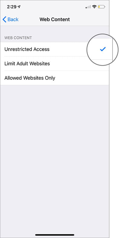 Ahora, sigue los mismos pasos mencionados anteriormente en iOS 12 para restringir o permitir el acceso a sitios individuales.