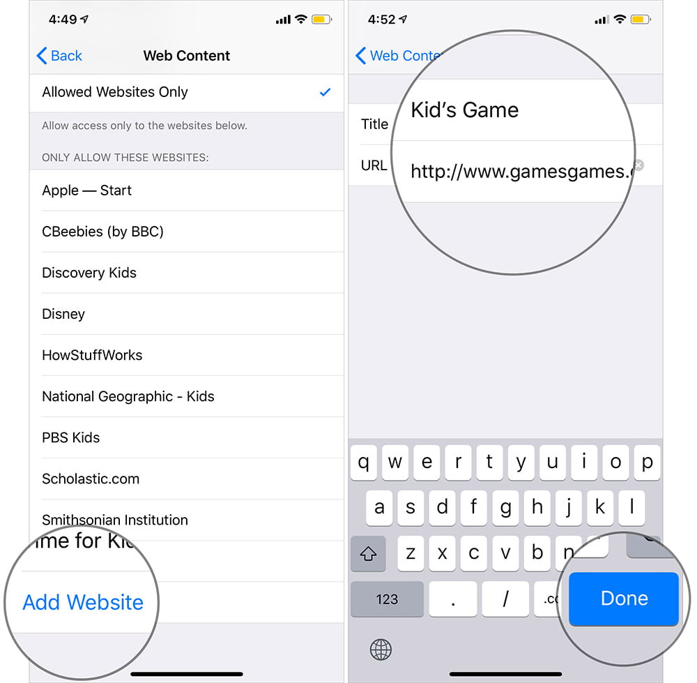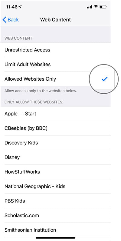 Sólo los sitios web permitidos: Si sólo quiere permitir el acceso a determinados sitios web, pulse Sólo sitios web permitidos. Ahora debería ver los nombres de algunos sitios web como Apple-Start, Disney y otros.