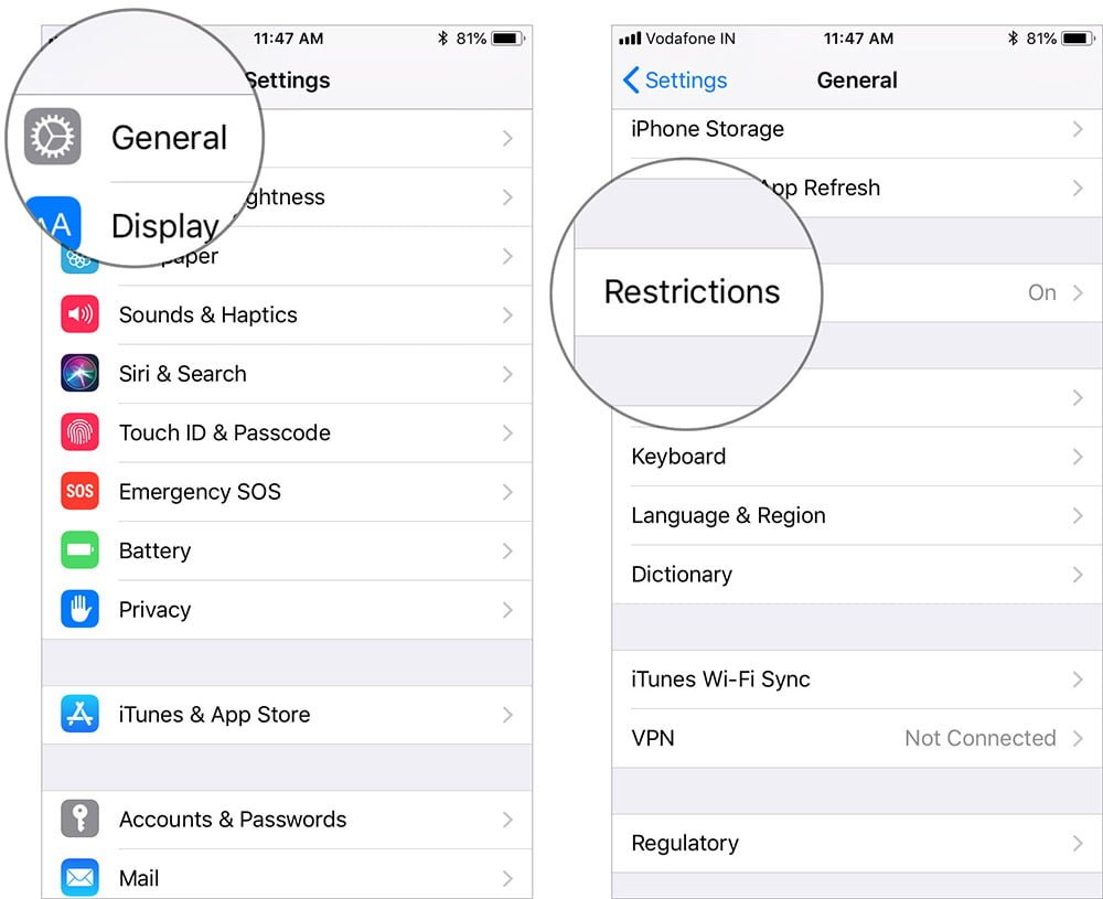 El proceso de bloqueo de los sitios para adultos es casi el mismo en iOS 11 o anterior. Para ello, abra Ajustes → General → Restricciones.