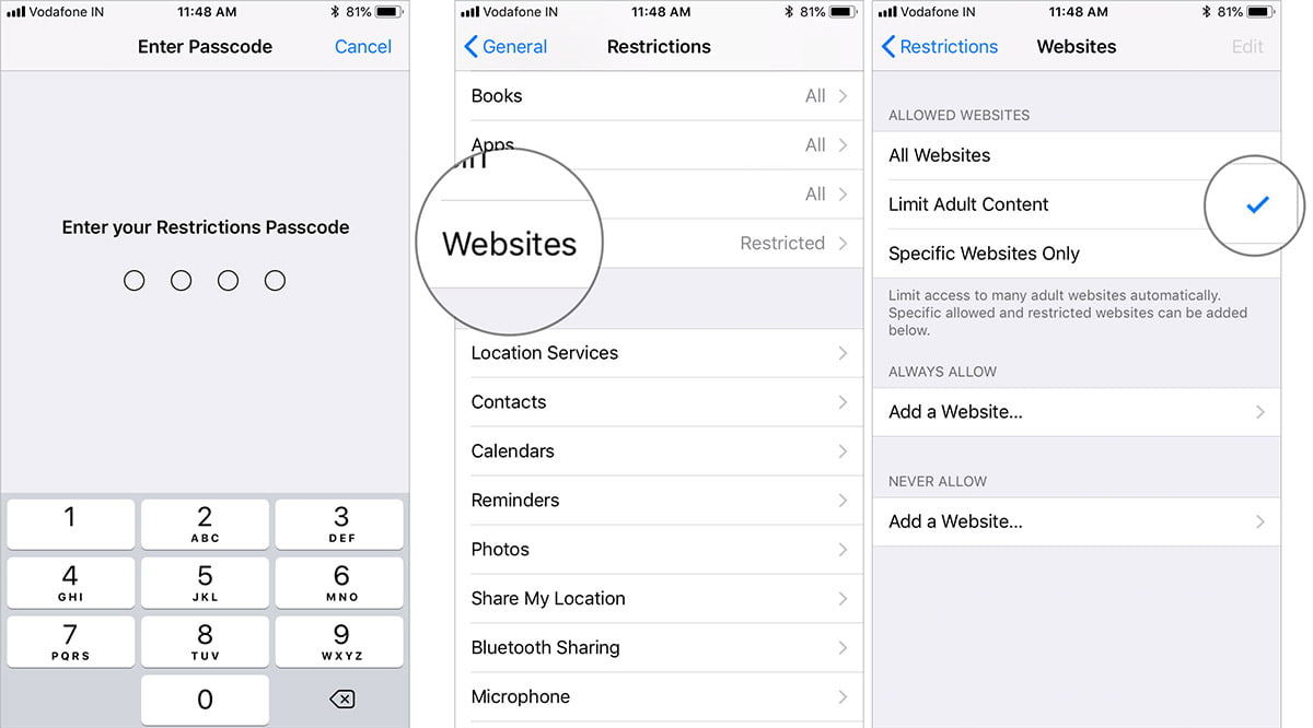 Así que, introduzca su código de acceso Restricciones → Páginas web → Restringir el contenido para adultos.