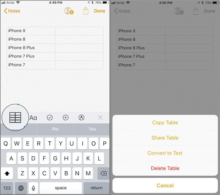 Cómo añadir una tabla en la nota en el iPhone en iOS 11