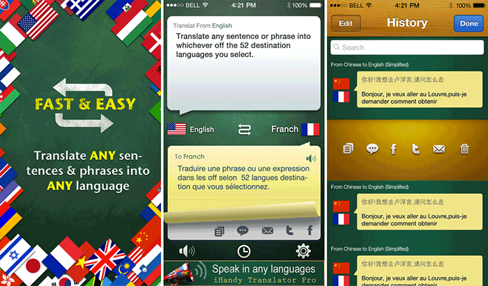 iHandy cuenta con una interfaz de usuario sencilla e intuitiva que ofrece una traducción rápida e instantánea de frases, oraciones, palabras y demás en un abrir y cerrar de ojos. La aplicación es compatible con unos 52 idiomas del mundo y te libera de la molestia de recordar y volver a escribir las selecciones guardándolas como un historial. Tiene una función integrada de copiar y pegar y también es compatible con las redes sociales.