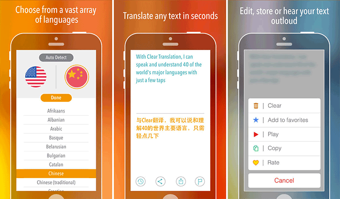 Elija Clear Translation para transformarse instantáneamente en un comunicador capaz. La aplicación permite traducir textos en 30 idiomas. Puedes escuchar tu traducción en tu idioma favorito.