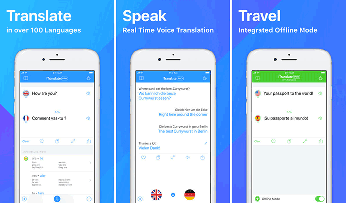 iTranslate, una de las aplicaciones de traducción más populares, puede traducir palabras, frases y textos en más de 100 idiomas compatibles. Puede escuchar las traducciones en voz masculina y femenina. Cambia de dialecto.