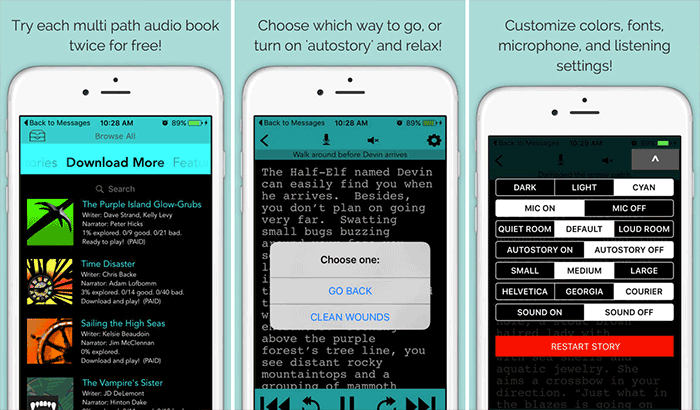 El audio multitrayectoria está lleno de diversión. La diversión para niños y adultos está lista. Presenta algunas historias que han sido escritas por algunos autores y narradores. Las historias de ficción interactiva pertenecen a diferentes géneros como la fantasía, los vampiros, los piratas, la Si-Fi y los niños, etc. También puedes descargar historias interesantes para escucharlas sin conexión.