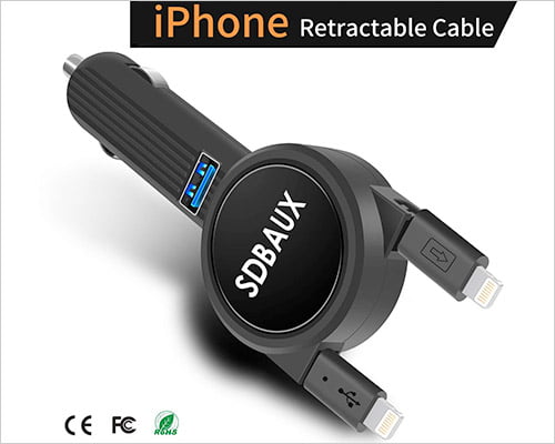 SDBAUX ha desarrollado un diseño único en su cargador de coche para iPhone. Una vez que instales este cargador en la toma de corriente del coche, podrás cargar tres dispositivos a la vez. El cargador tiene dos cables Lightning, que son retráctiles; saca el cable y carga tu iPhone o iPad. Y hay una única salida USB en la parte trasera de este cargador.