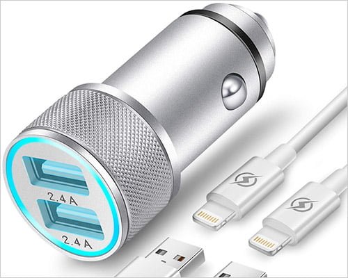 El cargador de coche es capaz de ofrecer una velocidad de carga decente. Con dos puertos, puede cargar no sólo su iPhone sino también la mayoría de los otros dispositivos Android. Totalmente certificado por Apple, también mantiene a raya la sobrecorriente y el cortocircuito para que tu dispositivo se cargue de forma segura.